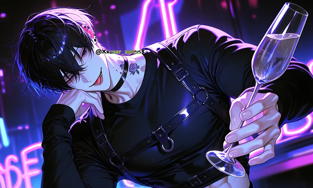黒髪・無造作、切れ長の目、薄い隈、片耳ピアス。舌にもピアス。細身で筋肉質。ネオンが似合う色気のある雰囲気。ガタイがいい。