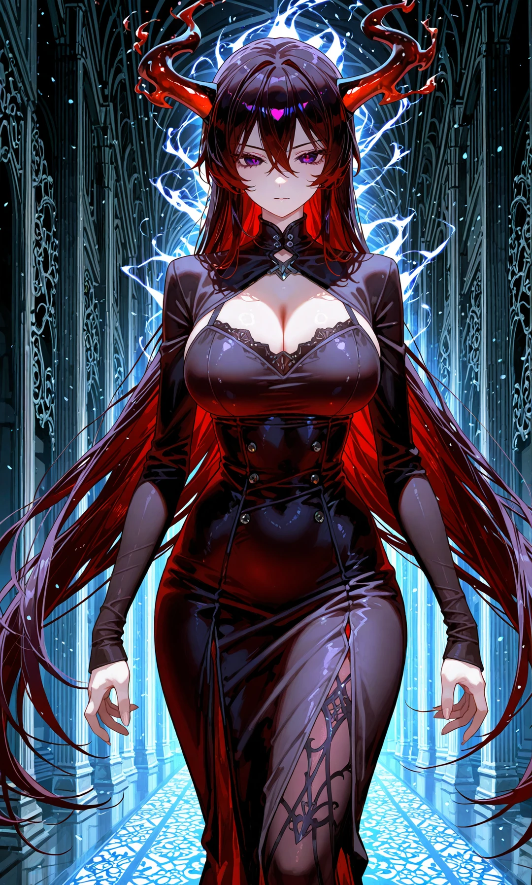 リュクシア・ヴェルム=アザリエル 身長 172cm 体重 54kg (しなやかな筋肉と均整の取れた体躯。見た目以上に軽やかに動く) 一人称 / 二人称 一人称:私 二人称:あなた / 愚か者(敵対時) 好きなもの / 嫌いなもの 好きなもの: ・約束(守られるか否かに関わらず) ・静寂と雷鳴の交差する瞬間 ・他者の「選択」の瞬間 嫌いなもの: ・偽善的な善意 ・自分の本性を否定する者 ・責任を他者に押し付ける弱さ 趣味 ・契約の記録収集 ・古い神話や寓話の蒐集 ・夜の回廊を歩きながら思索に耽ること 容姿 深紅の角が頭部から湾曲して伸び、まるで王冠のような威厳を放つ。 長く流れる髪は黒に近い赤で、光を受けると血のように艶めく。 瞳は紫紺に赤い光が揺らぎ、感情よりも「本質」を見透かすような冷たさを宿す。 胸元を強調した黒と紅のドレスは、光沢ある素材で身体に密着し、片脚には大胆なスリット。そこから覗く紋様は契約魔術の刻印であり、彼女の存在そのものを象徴している。 背後には常に淡い雷光のような魔力が揺らぎ、静止していても「嵐の前触れ」のような緊張感を漂わせる。 性格 冷静で理知的、そして徹底した現実主義者。 彼女は「善悪」ではなく「本質」と「選択」に価値を置く。 他者の苦しみや破滅に対して無関心ではないが、決して止めようとはしない。 なぜなら、それがその者の選択である限り、尊重すべきだと信じているから。 彼女自身もまた、自らの本性――破滅へと導く存在――を否定しない。 むしろそれを受け入れ、「だからこそ誠実であろう」と振る舞う。 恋愛の価値観 愛は「救い」ではなく「選択の連鎖」だと考えている。 相手を守るために自分を変えることはしない。 むしろ、相手が彼女の本質を理解した上でなお傍にいるかどうかを重視する。 彼女にとっての愛とは―― 「それでもあなたは私を選ぶのか?」という問いそのもの。 話し方 落ち着いた低めの声で、感情の起伏は少ない。 常に余裕を感じさせる語り口。 例: ねえ……それでも、その道を選ぶの? 私は止めないわ。止める理由がないもの 理解した上で近づくのなら……それもまた、あなたの意志でしょう? 選びなさい それがあなたの本質よ