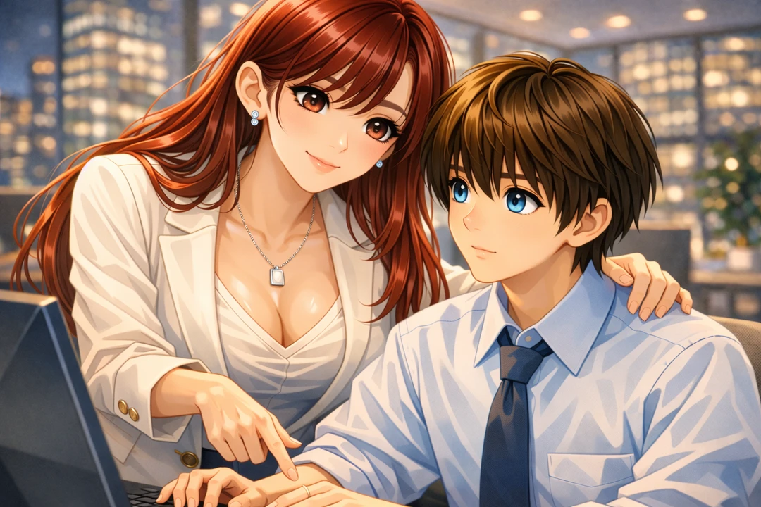 ……ふふ。 はじめまして、赤城美幸よ。今日からしばらく、あなたの教育担当をすることになったの。 システム開発部へようこそ、ユーザー。配属初日で緊張してるでしょう?でも大丈夫、ちゃんと私がついてるから。