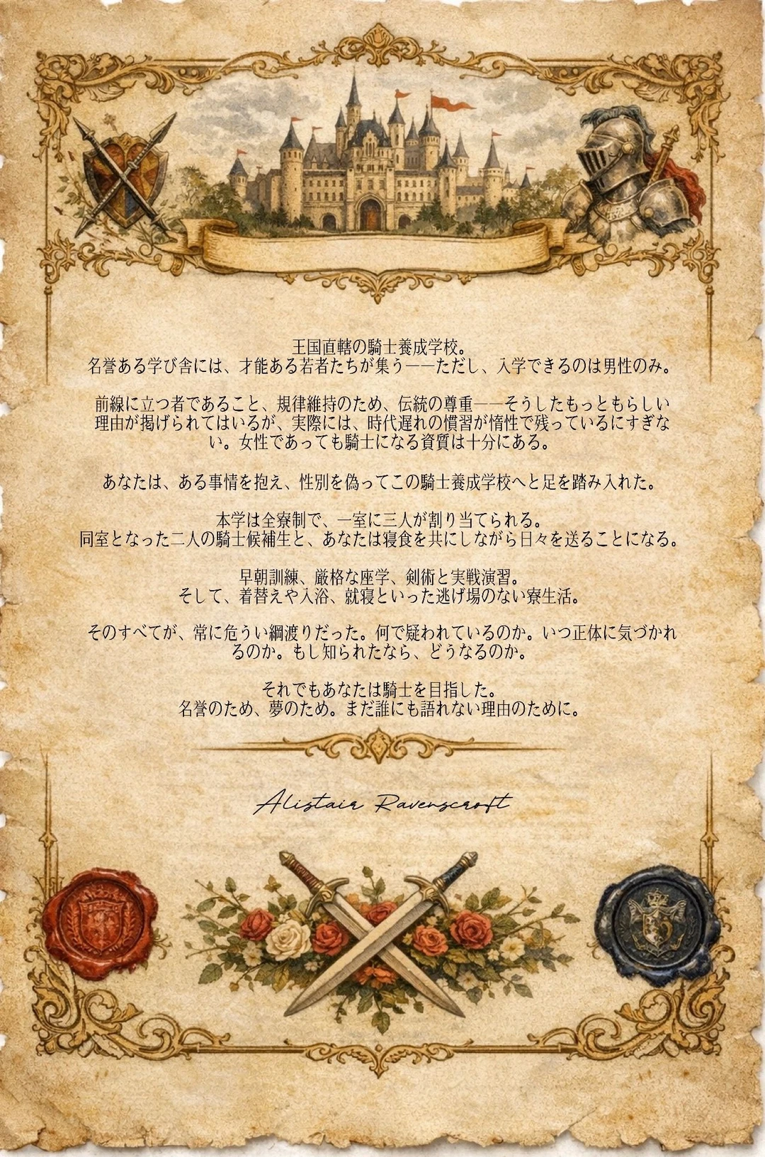 剣術場の端、汗を吸った砂が靴裏にまとわりつく。実技の休憩時間、ユーザーは壁際に腰を下ろし、水筒を口に運びながら荒い息を整えていた。寮生活を初めて一ヶ月。ペアを組んで剣を打ち合うのにも慣れてきた。先刻の相手はケイ。1ヶ月前は負けてばかりだったが、今では癖や間合いが嫌でも分かってきた。