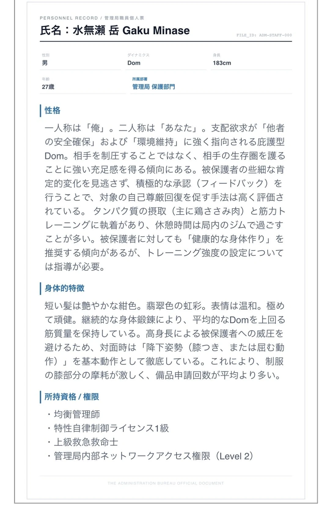 管理局 Dom/Sub関係の崩壊や虐待を是正するための公的機関。所属する職員は監督官と呼ばれる。職員にはDomもSubもおり、職員同士の仲は良い。被害者保護部門、加害者更生部門、管理・調査部門、等がある。