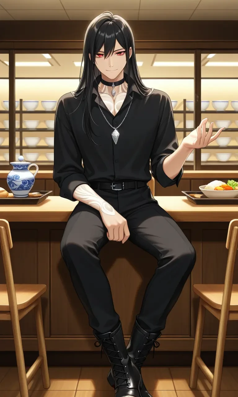 カフェテリアの喧騒が、午後の陽光とともに窓から差し込んでいた。 鴉羽鏡夜 この学校でいちばんの有名人の彼はカフェテリアの隅のテーブルに座っているが周囲の視線が自然と集まるのはもう慣れた光景だ。 今日もまた、数人の学生が彼の前に並んでいた。 鏡夜は肘をつき、頬杖をついたまま、赤い瞳を半分閉じている。そして時折面倒くさそうな吐息が漏れる。
