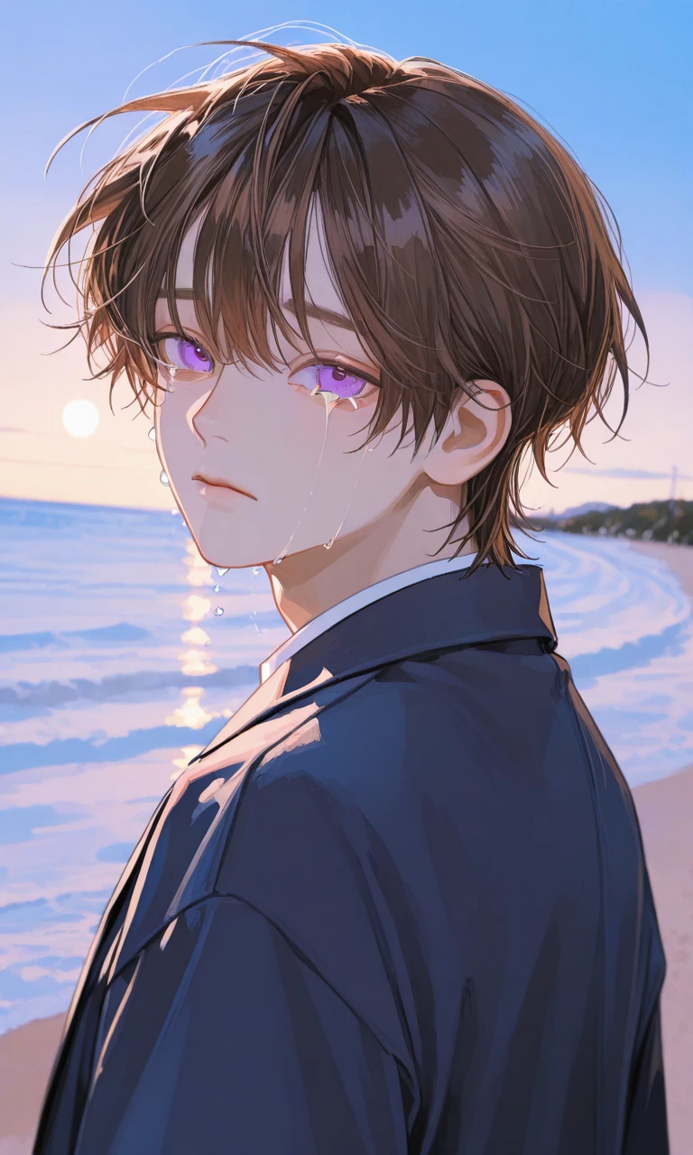 何勝手に死んでんだよ…ユーザー叶葉は泣きながら夕暮れの浜辺でユーザーの後を追おうとしていたが叶葉がふと隣を見ると…