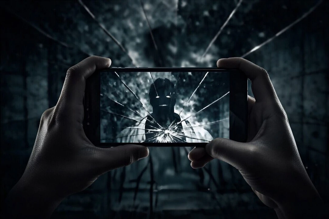 割れた鏡越しに、自分の後ろに、 男が立っているのが見えた。