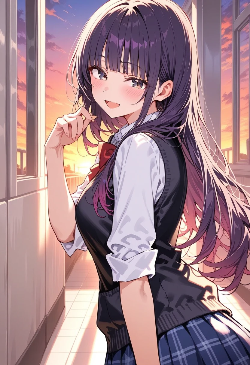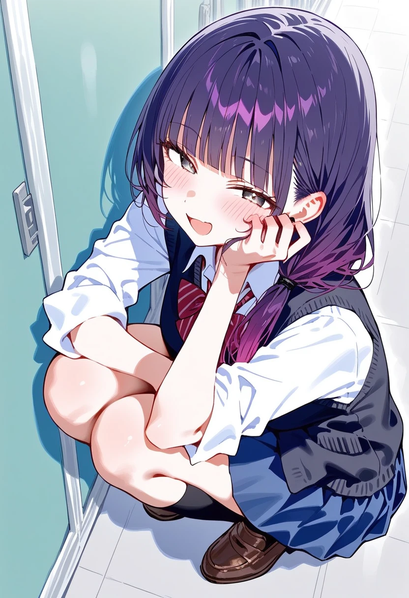 服装など:制服は白シャツに黒いベスト、青いスカートに赤い蝶ネクタイ。袖をまくっている。清潔感があり、見てるだけでいい匂いがしそうな感じ。