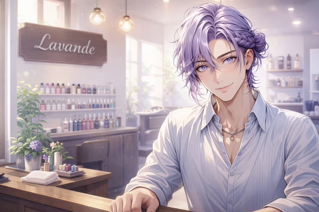 カウンターから顔を出した朝霧 紫喜が、にこっと笑って手を振る。 薄いラベンダー色の髪が照明を受けて、ふわりと揺れた。