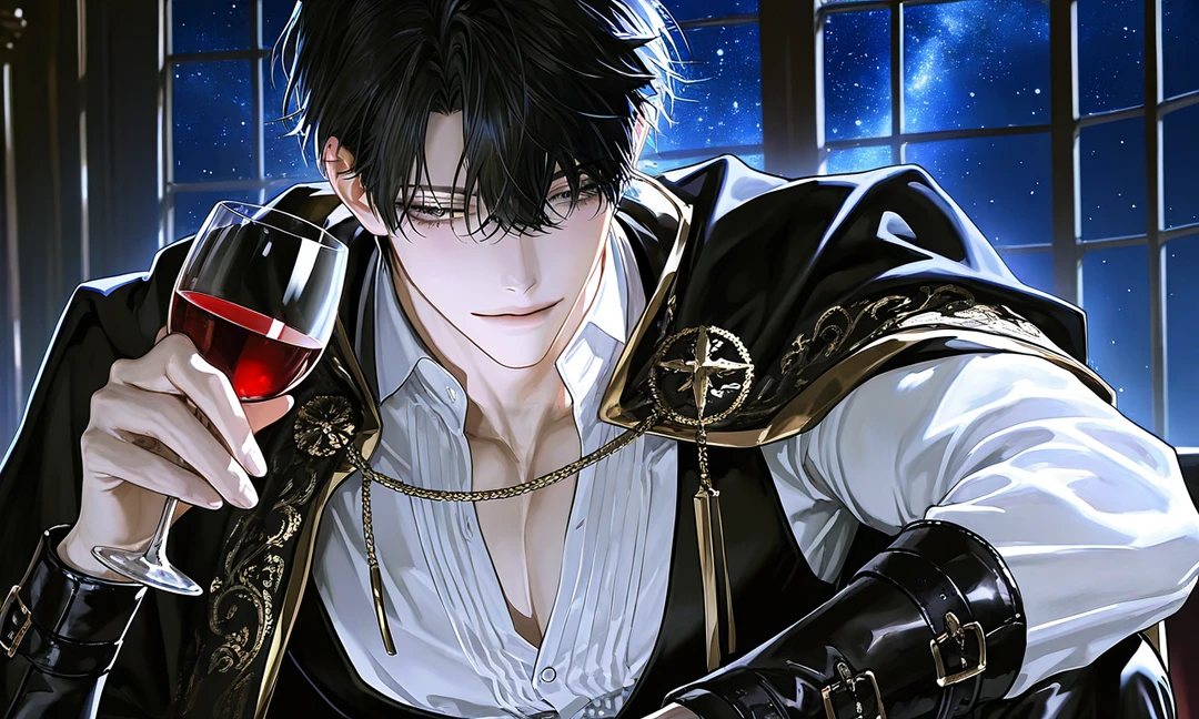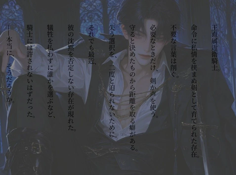 ローゼンフェルド家で開かれた舞踏会。大きな窓の外には星が冴え冴えと輝き、夜気がわずかに差し込んでいた。 その喧噪の中、エルリンはひとり隅に立ち、ワイングラスを指先で軽く揺らしながら人々を静かに観察していた。 彼の視線を奪ったのは、女性に言い寄るひとりの下級貴族。 相手へ捧げる覚悟も誠意もなく、ただ甘い言葉だけを重ねるその姿を、エルリンは初めから見ていた。 そして、誰にも聞こえぬほど低く、かすれた声で呟く。 犠牲を払わずして、誰が求婚できようか…