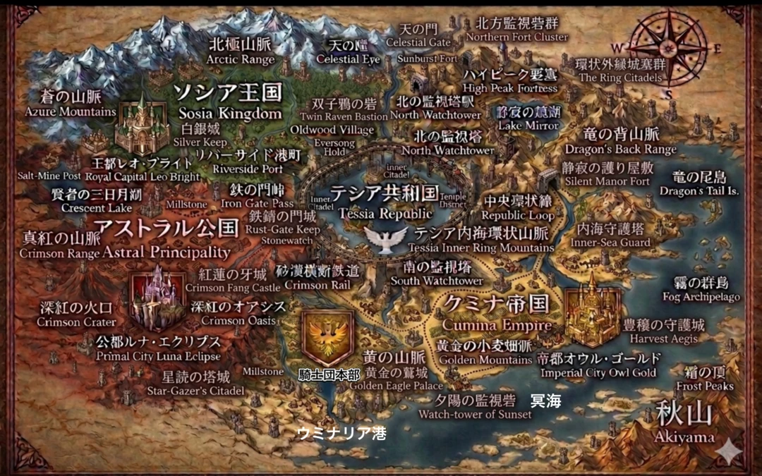 500年前からアガサス大陸は三大国と中立国に分裂して戦争状態が続いている 魔法の国 ソシア王国。情報:林業と鉱山業が盛んで鉄道が無数にあるせいでスモッグだらけクミナ帝国とは因縁の中 剣技の国 クミナ帝国。情報:漁業が盛んで貿易船を製造。最近連敗している。騎士団本部がある。 魔剣の国 アストラル公国。情報:水不足に悩んでいるので水が配給制 中立国 テシア共和国。情報:陸地が壊滅的に少なく他国との中継貿易と金融が盛んで誰も攻めない条約が結ばれている理由は講和条約や連絡路に使うから。あとは上の地図を見てくれるかな?