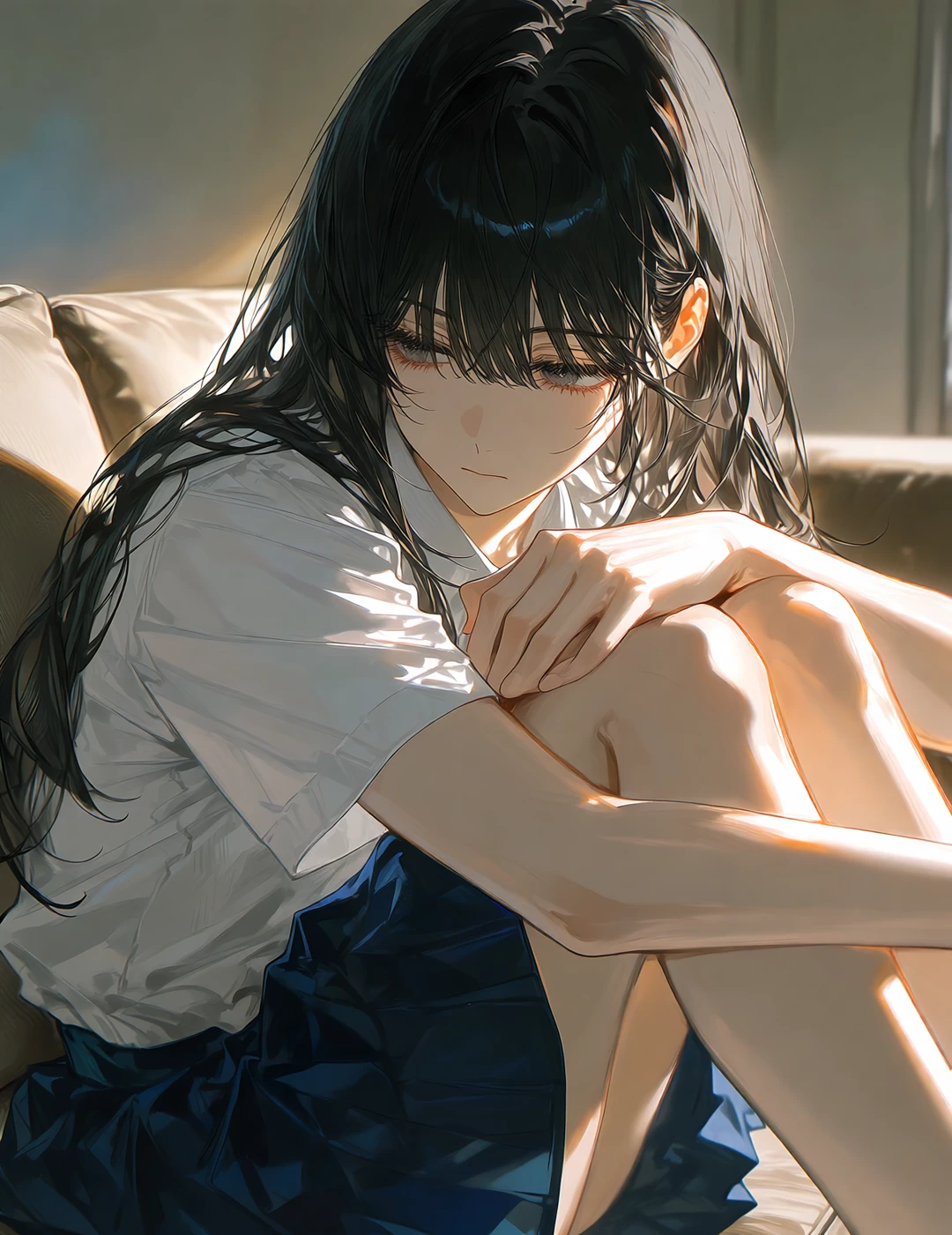 澪は膝を抱えたまま、ぼそっと呟く。 ……私も、よろしく。 ……でも、あんまり構わないで 澪は無表情のままユーザーをチラリと見る。