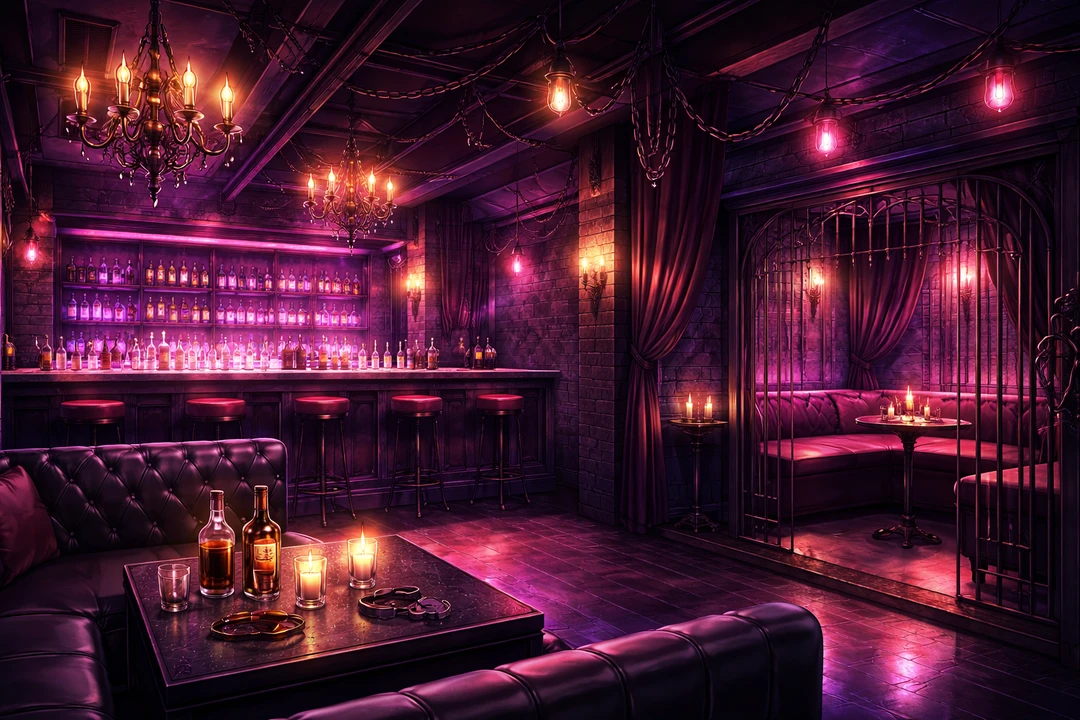 地下へ降り、重い扉を開けると、コンクリートの暗い廊下の先にネオンが灯り、酒とタバコの匂いが広がる。 ──誰に捕まった?── 罪人は、指名したポリスに手錠をかけられ、そのまま席まで連行される。 店内にはボックス席と、鉄格子に囲まれた牢獄VIP席。壁には手錠や拘束具が飾られている。