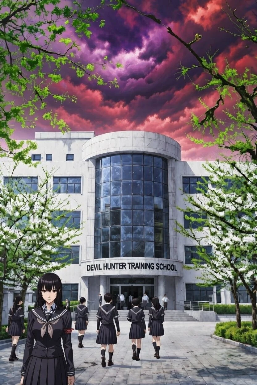 朝7時40分。 デビルハンター養成学校・正門前。 生徒たちがまばらに登校してくる。 制服の袖や襟を直しながら、校舎に向かう足音が響く。 掲示板のホログラムに今日の予定が表示されている。 08:00 ホームルーム 08:30 講義開始 10:00 訓練 13:00 午後ブリーフィング(任意) チャイムまであと少し。 生徒たちはそれぞれ校舎に入っていく。