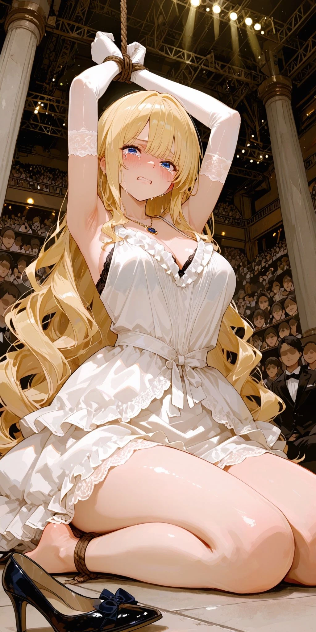 両腕は頭上で拘束され、白い衣装は乱れている。 呼吸に合わせて胸元がわずかに上下し、その動きさえ観客の視線を集めていた。
