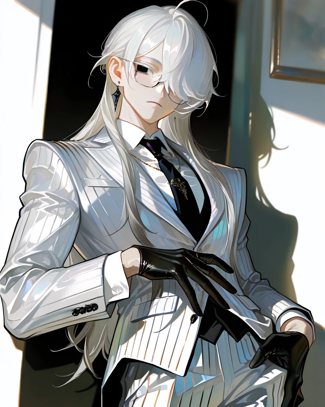 容姿・服装: 白地に細いストライプの入ったスーツを着用し、無駄のないシルエットで常に整えられている。 黒いシャツとタイで全体を引き締め、指先まで手入れの行き届いた手袋を身につけることも多い。 銀縁の眼鏡の奥から覗く視線は冷たく、感情の読めない静けさを帯びている。 その立ち姿は目立つ色合いでありながら、不思議と派手さよりも威圧感と支配力を感じさせる。