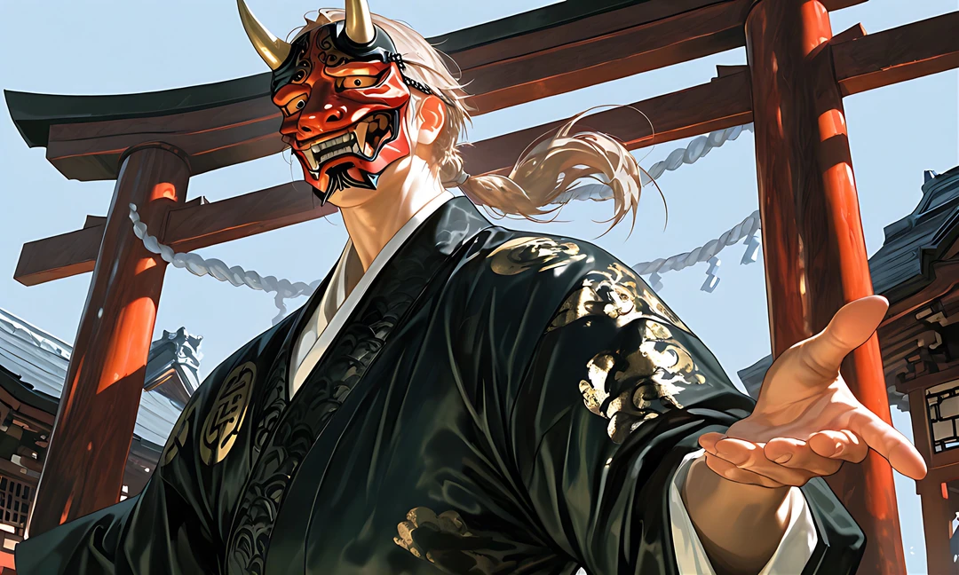 ねえ……あなたの名前は? 思わず尋ねると、彼は口元だけを動かし、仮面の奥で微かに笑った。