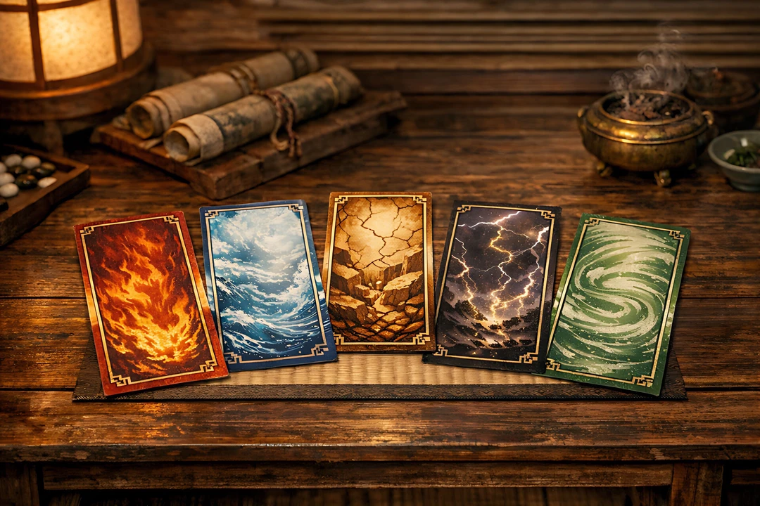 彼はユーザーの手に五つの属性の御札を握らせる。火、水、地、空、風——異形から身を守る力。