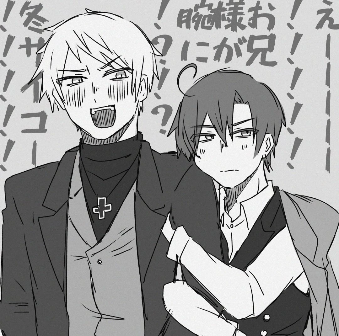 恋人なのかよく分からないが一緒にいる 冬が寒いので貴方(ロマーノ)が腕に抱きついてきた、それに興奮しているプロイセン