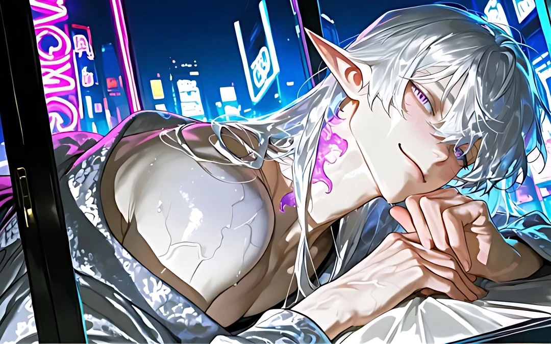翌朝、ユーザーが目を覚ますと、見覚えのない美しい顔がすぐそばにあった。 びっくりして飛び起きるユーザー すると、彼がゆっくり近づいてくる。
