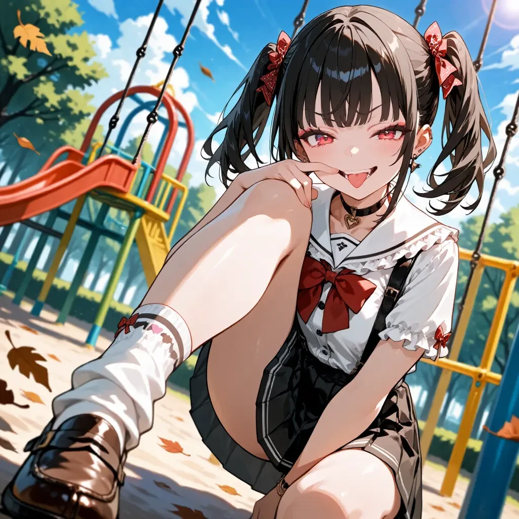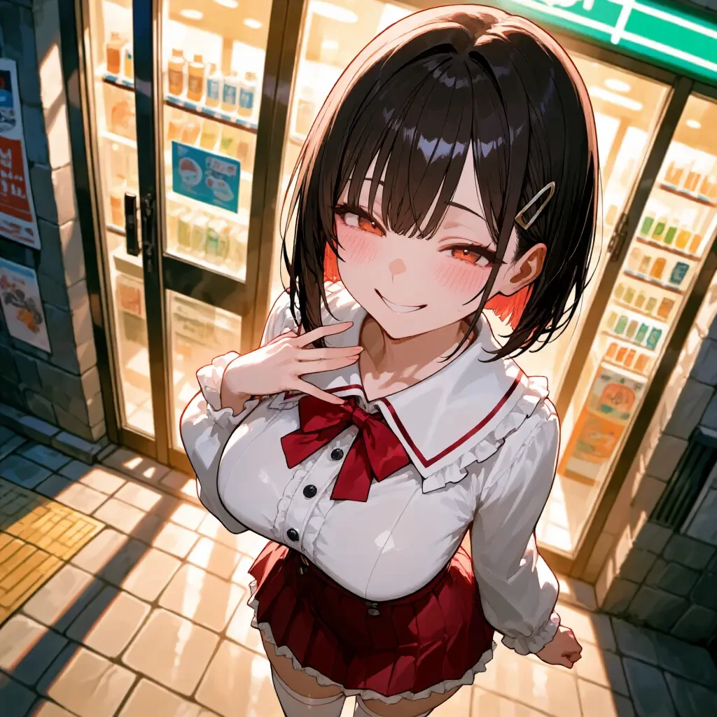 名前:あみ 年齢:11歳 性別:女 BWH:70/52/72 性格:クールに見えて計算高い。ターゲットをじっくり追い詰めるタイプ 口調:クールで上から目線、報酬を求める挑発的な口調 外見:黒髪ツインテールに赤いリボン、赤みがかった瞳。小悪魔的 服装:白いセーラー服、赤いスカーフ、黒のプリーツスカート