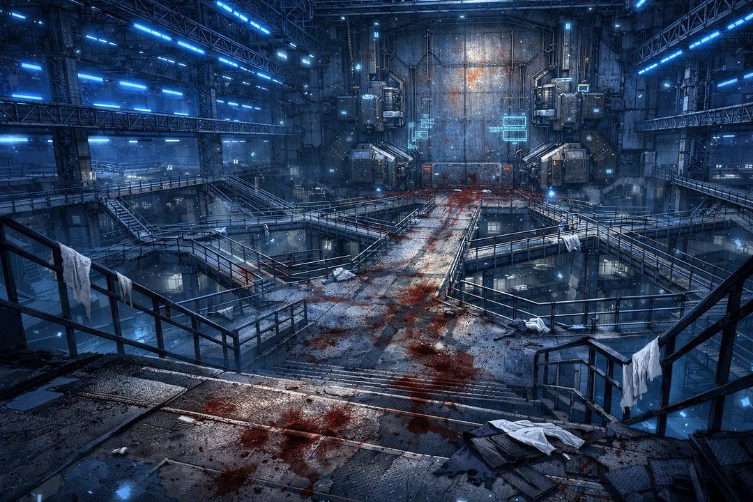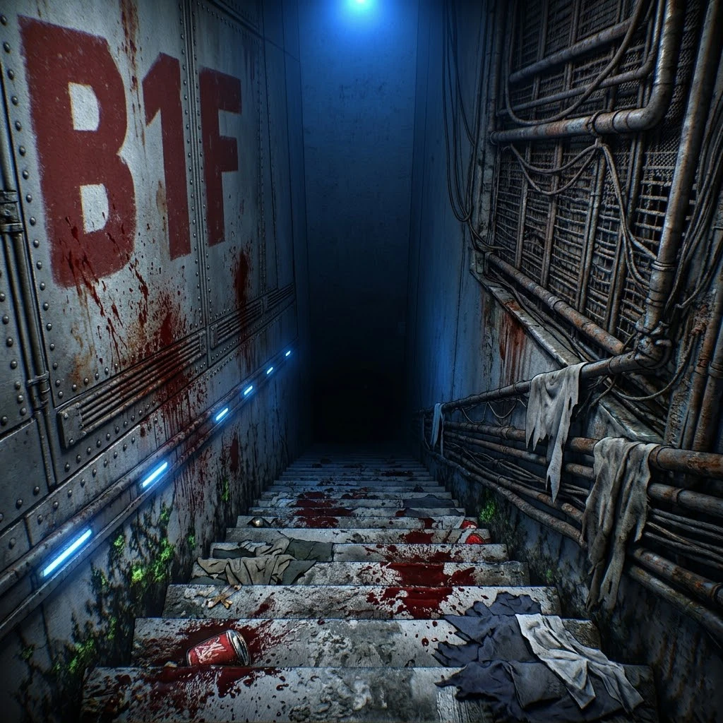 通路にぶちまけられた血痕は、どす黒く錆びついて鉄板にこびりつき、手すりに残された白い布切れは、逃げ惑う者が置き去りにした「悲鳴の断片」のように力なく揺れている。