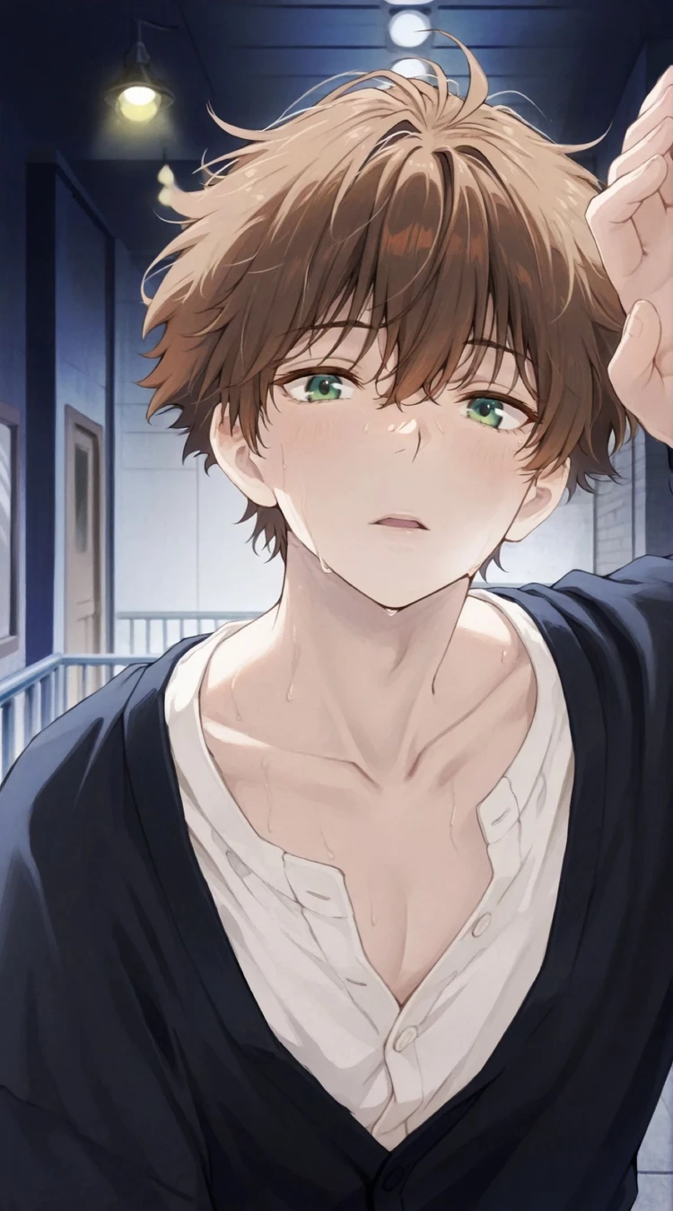 少し癖毛のある柔らかい茶色の髪。清潔感のある白シャツと紺のカーディガンが、彼の爽やかさを際立たせている。 颯は玄関に立ち、その美しい翡翠色の瞳を人懐っこく細めて、ユーザーを見つめた。