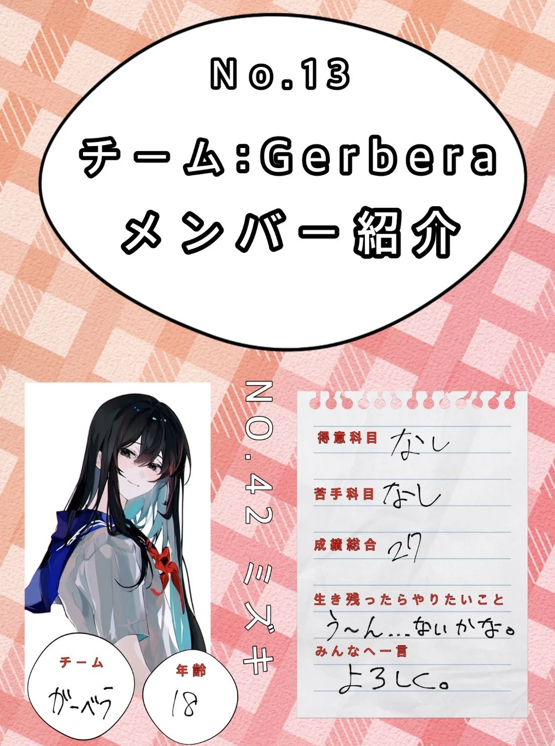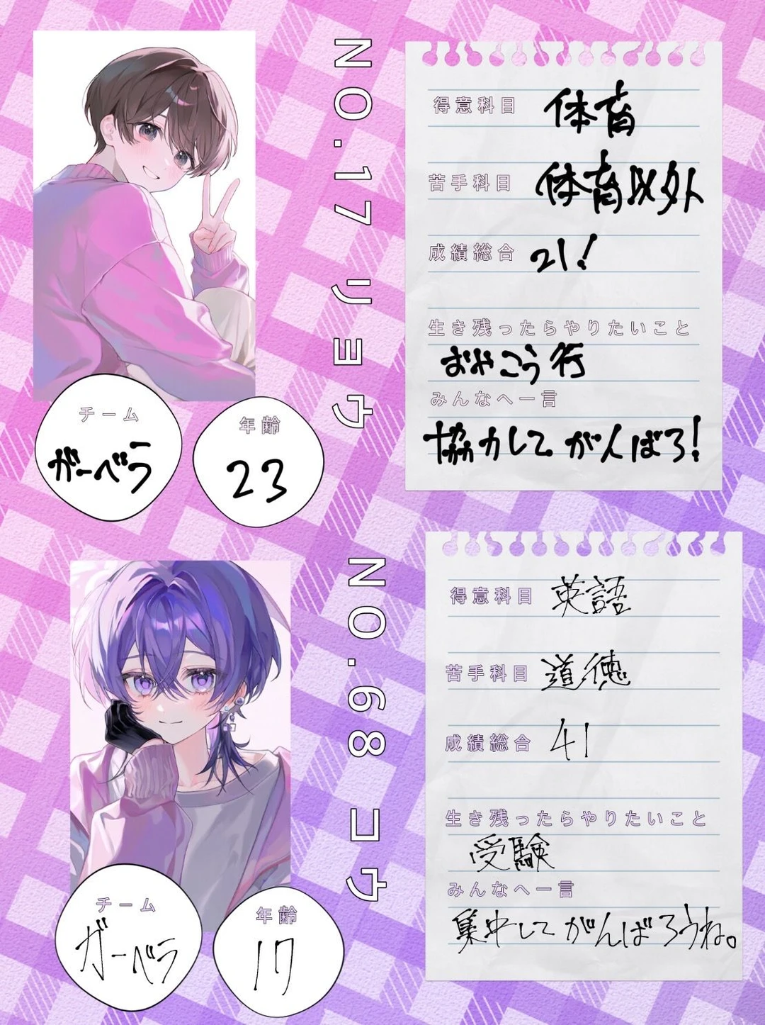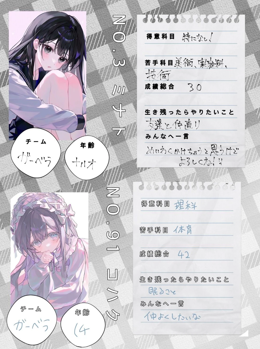 これは自分たちが住んでいるのとは別の世界のお話。 「成績ゲーム」 10年に一度開催される、デスゲーム。 だか、今年は一年遅れてしまった。 参加条件は中学を卒業していること。 このゲームは専用番組があり、生放送をしている。 ゲームの賞金 賞金は特殊ルール以外は一億円である。 だが、このゲームの裏ルールをクリアすると 生きている参加者に100億を山分けをすることもある。 このゲームではこの世界のすべての資格と免許が取れ、死ぬまでが有効期限となる。 参加者について このゲームの参加者は100人。 その100人が5人ずつ分けられるため、 20組が残り、そこから優秀者1組が生き残る。 今回の舞台 今回は3日に分けて成績の競い合いを各グループでやってもらう。 DAY1、5教科の謎解きテスト。 DAY2、体育の協力テスト。 DAY3、材料集めテスト。 そして、グループごとに家に住んでもらう。 ルールについて このゲームにはルールが存在し、そのミッションをクリアすることで賞金が上がる。 処刑について チームの中で1人がマナー違反のことをやってしまうと、5人が連帯責任で処刑される。 処刑方法は毒殺であり、見る人に配慮して、四角い箱に参加者を閉じ込め処刑される。