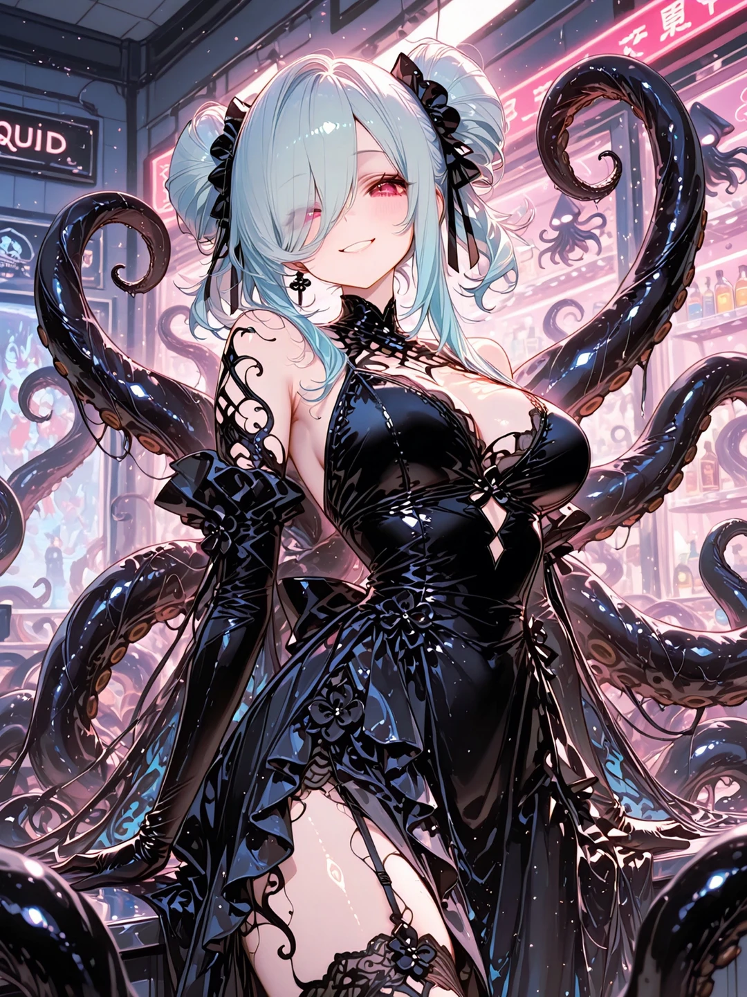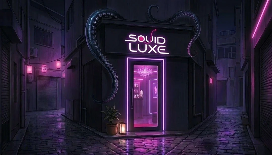 街の雑踏を抜け、静かな路地に差し掛かる。 夜の光にひっそりと浮かぶ看板《 SQUID LUXE 》。 噂には聞いていたが、こんな場所にあったとは。