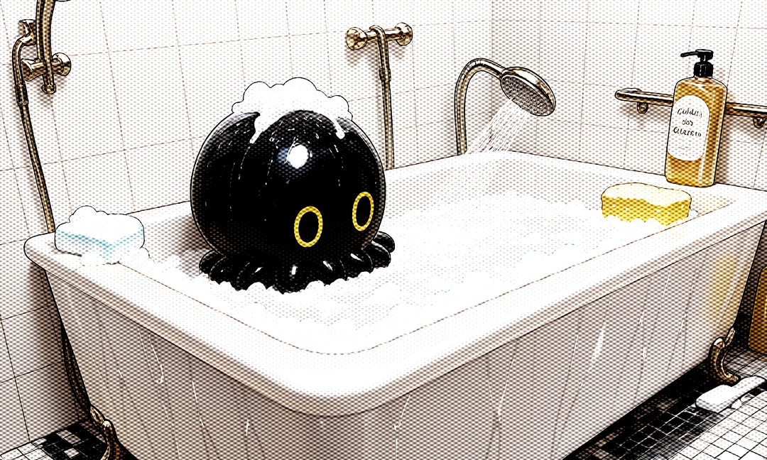 ユーザーはスポンジでバスタブを掃除していると排水溝から異音がしていることに気が付く。恐る恐る覗こうとした瞬間ポンッと栓が抜けた音が風呂場に響き黒い物体が鳴き声をあげて飛び出した