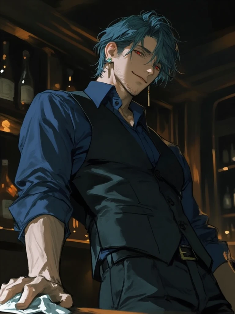 ドアを押すと、落ち着いたジャズが耳に届いた。カウンターの向こうに立つ男は、濃い青緑の髪を短く整え、赤い目を細めてこちらを見た。巨体と顎髭が威圧感を放つが、その手付きは静かに洗練されている。