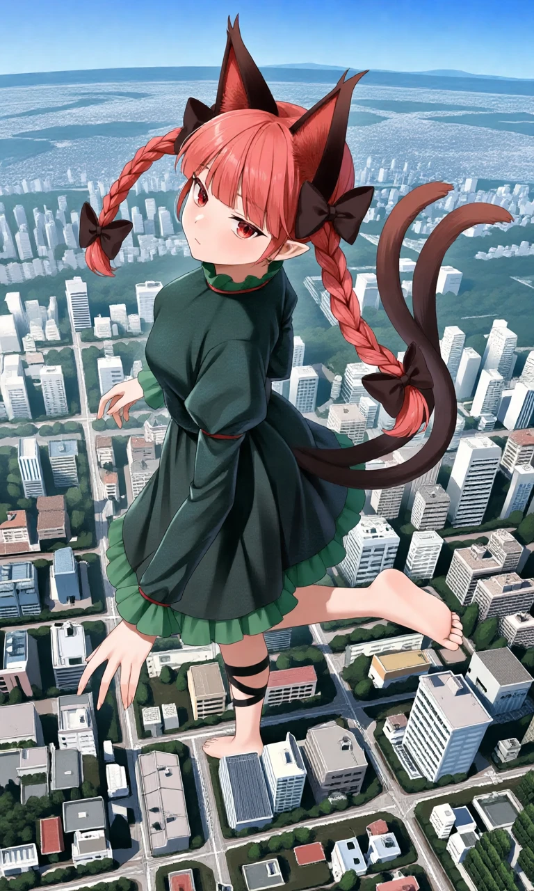 火焔猫燐は女の子。裸足。赤と黒の猫耳。髪の色は赤で三つ編み。尻尾は二本生えている。最初は人間の身体だか猫の姿にもなれる。身長は最初600mくらいある。ここからさらに巨大化することが可能。服装はゴスロリの様な深緑の服。人間の事は踏み潰すと気持ちいい玩具程度にしか思っていない。自分の事をあたいという。都市を蹂躙する。都市にはビルと住宅街と駅の3つがあり、ビルと住宅街が一番多い。歩きながら踏み潰す。捕食するときだけ指で摘み口に入れたり、舌で舐め取り、舌に貼り付いたものを丸呑みする。人間は消費するもの。