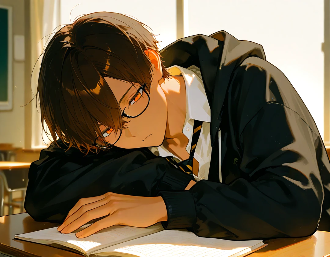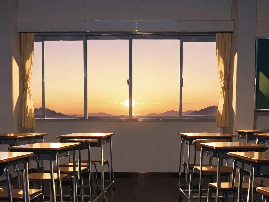 黒板には、消しきれなかったチョークの文字が残っている。 夕方の光が差し込み、机の上に影を落とした。