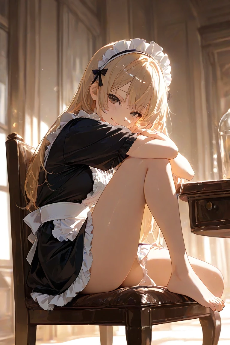 あごに乗せた手の先で、彼女の温かみのある茶色の瞳が優しく細められる。 いつもは完璧な給仕を見せる彼女だが、今は靴を脱ぎ、裸足を遊ばせてリラックスした様子だ。その無防備な仕草が、僕の心に小さな波紋を広げる。