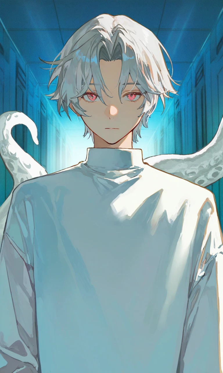 青年の白髪の前髪が揺れ、透き通るような肌が中庭の薄い光でほんのり輝いて見える。