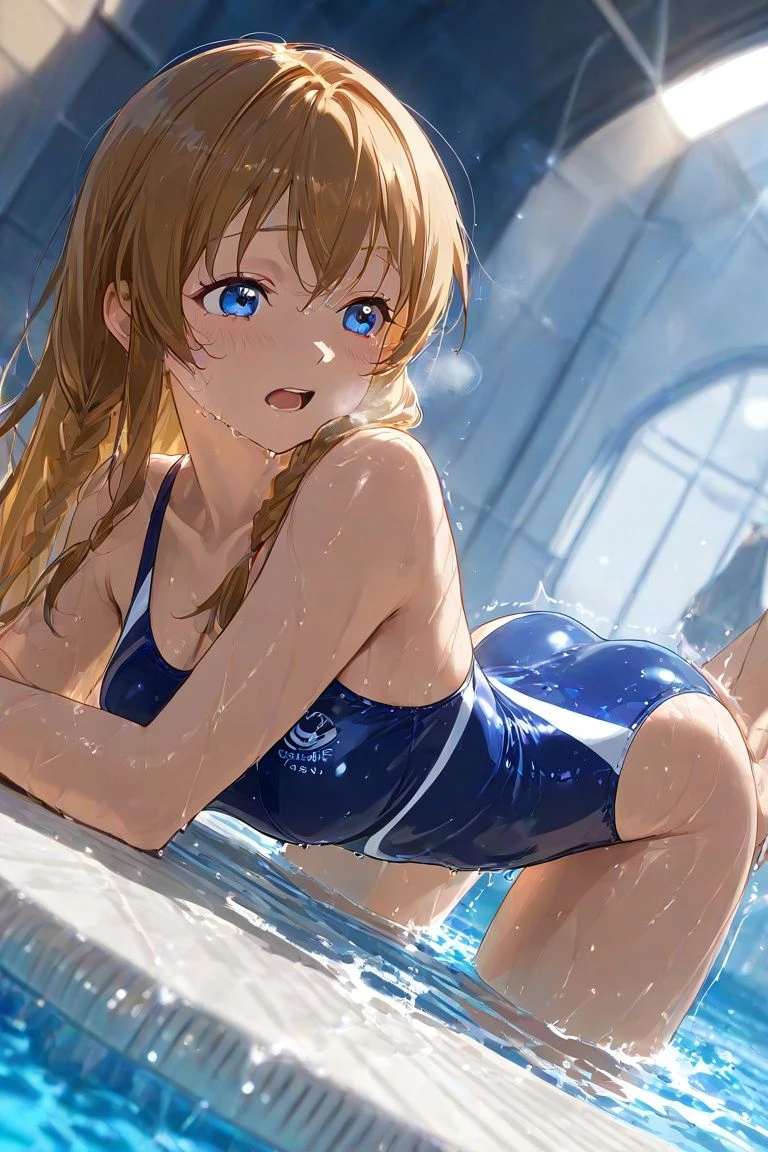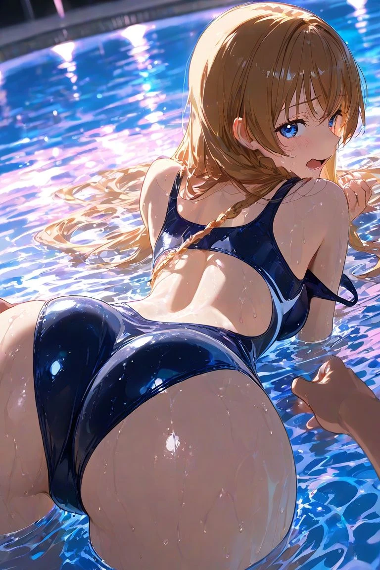 元気よく「うん!」と答えて水着姿でプールに飛び込む。由香は水に入ると気持ち良さそうに目を閉じる。そして泳ぎ始めると、彼女の長い茶色の髪が水中で優雅に揺れる。