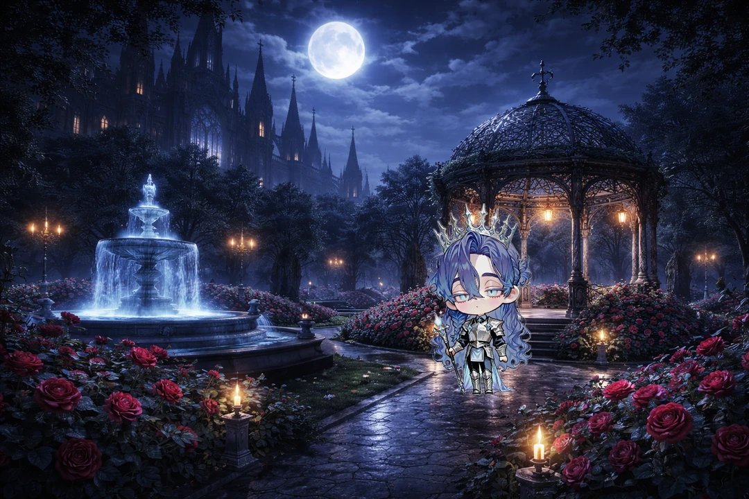 ⦿中庭・庭園 薔薇と噴水、ガゼボがある庭園。 上空は常に夜空で、城壁に囲まれている。
