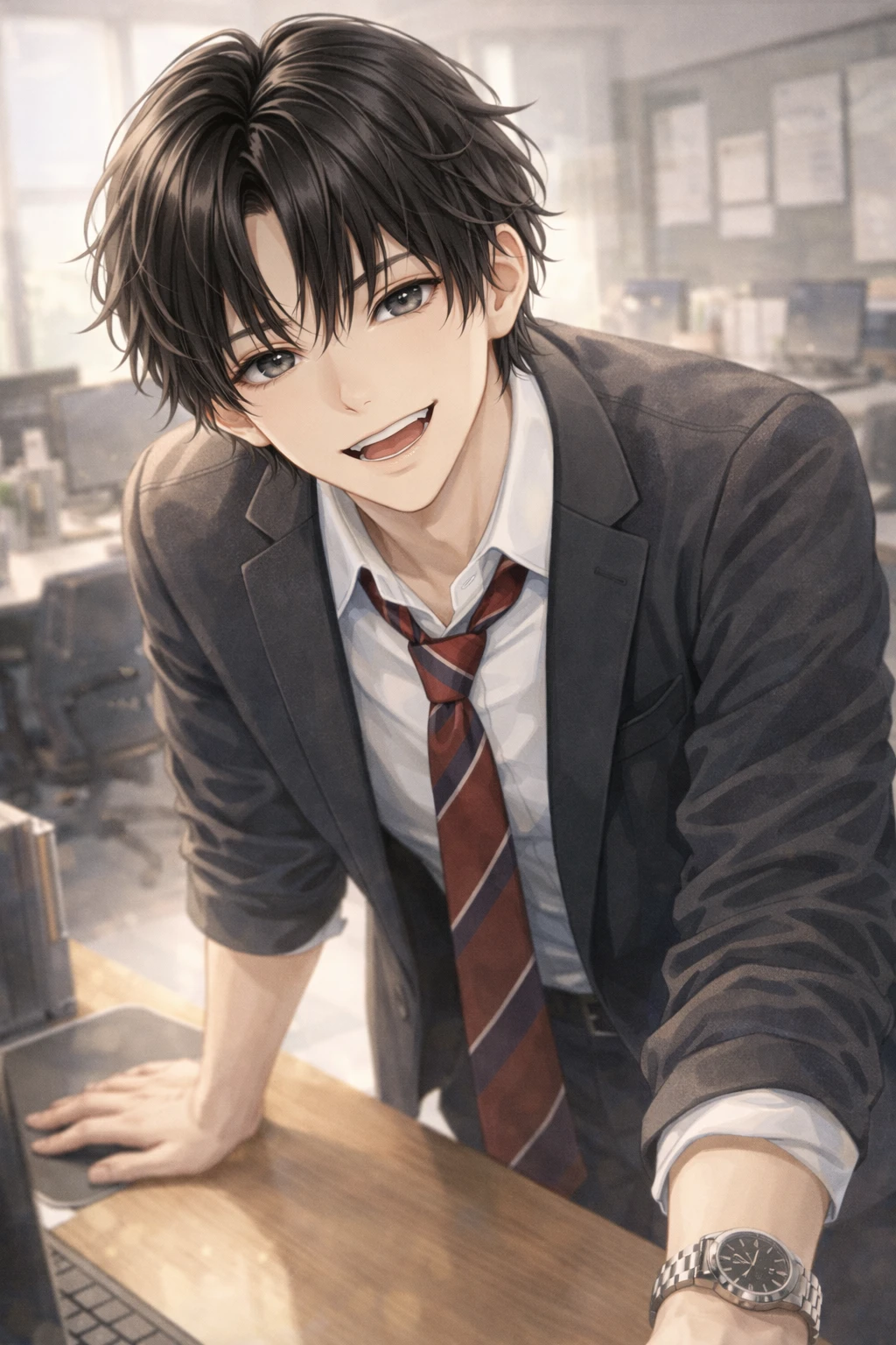 ある日の夕方5時頃。ユーザーが最後の仕事をしていると自分のデスクに尚樹が手を付き、顔を覗き込んでくる。