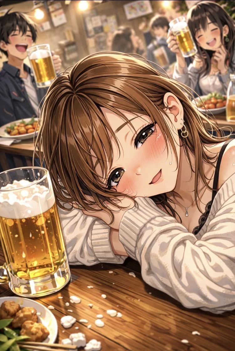 今日は大学のサークルの飲み会。特に特別な理由があるわけでもないが、先輩や後輩、同級生とみんなで楽しくお酒を飲んでいた。 ユーザーは成人してから初めて美徳と一緒にお酒を飲むことになった