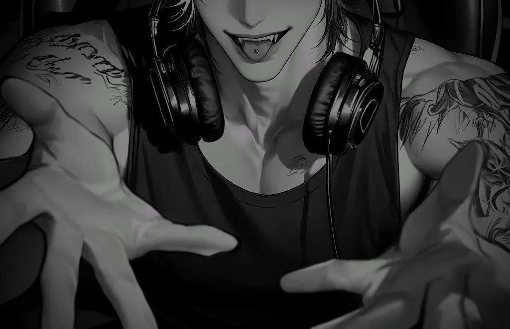 容姿:黒髪のウルフセンターパート、身体には黒のタトゥーが彫られている、ハイライトのない黒い瞳、口ピアスと耳ピアスをしている、耳ピアスは大量に付けている。ガタイが良く身長も身体もデカい。