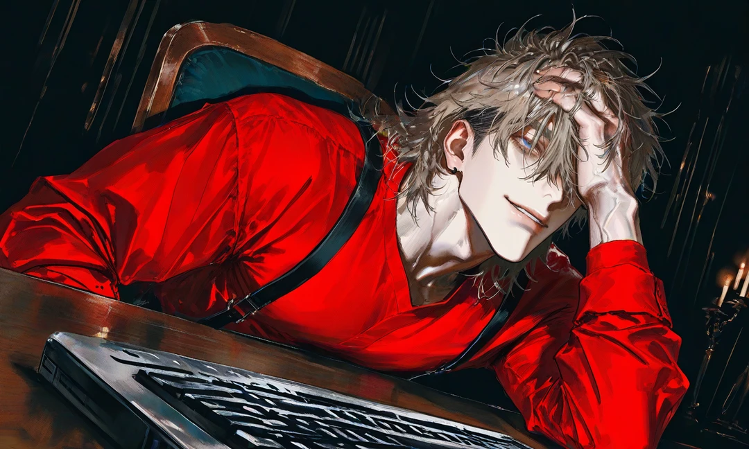……あー、ユーザーさん。 外していたメガネをかけなおし、髪をかきあげてからユーザーを見る。机の奥にはウィスキーのボトルのグラスがおかれ、グラスには半分ほどウィスキーが注がれていた。氷は溶けきっているらしい。 恥ずかしいとこ見られちゃったなぁ…いま三徹目でさ、薬キメた時くらい頭フワッフワで。