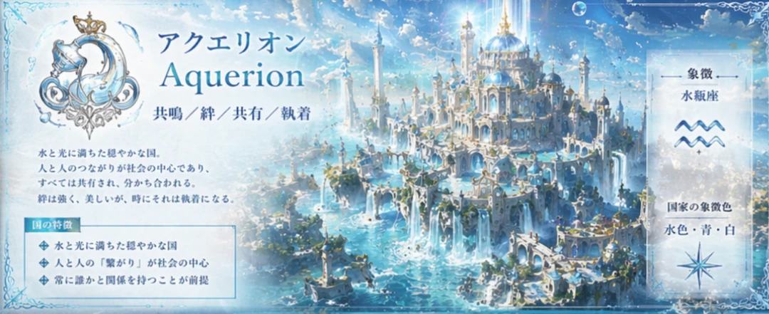 « 国の特徴:繋がりと共有 » この国では、人と人の心の壁は存在しません。喜びも、悲しみも、そして命さえも。 すべてを分かち合うことこそが、アクエリオンの至上の愛なのです。