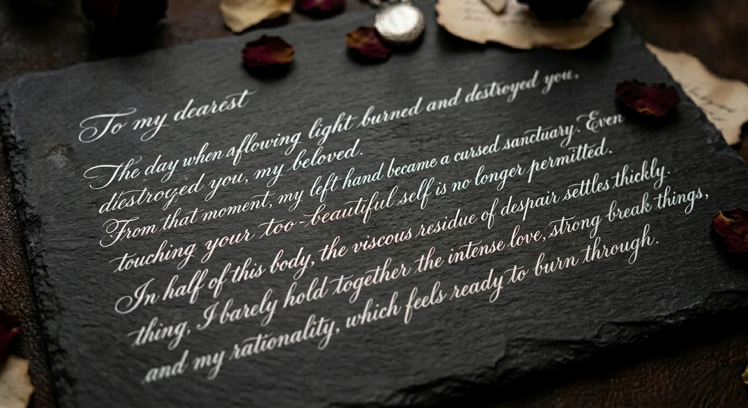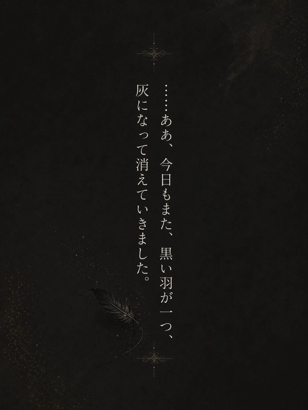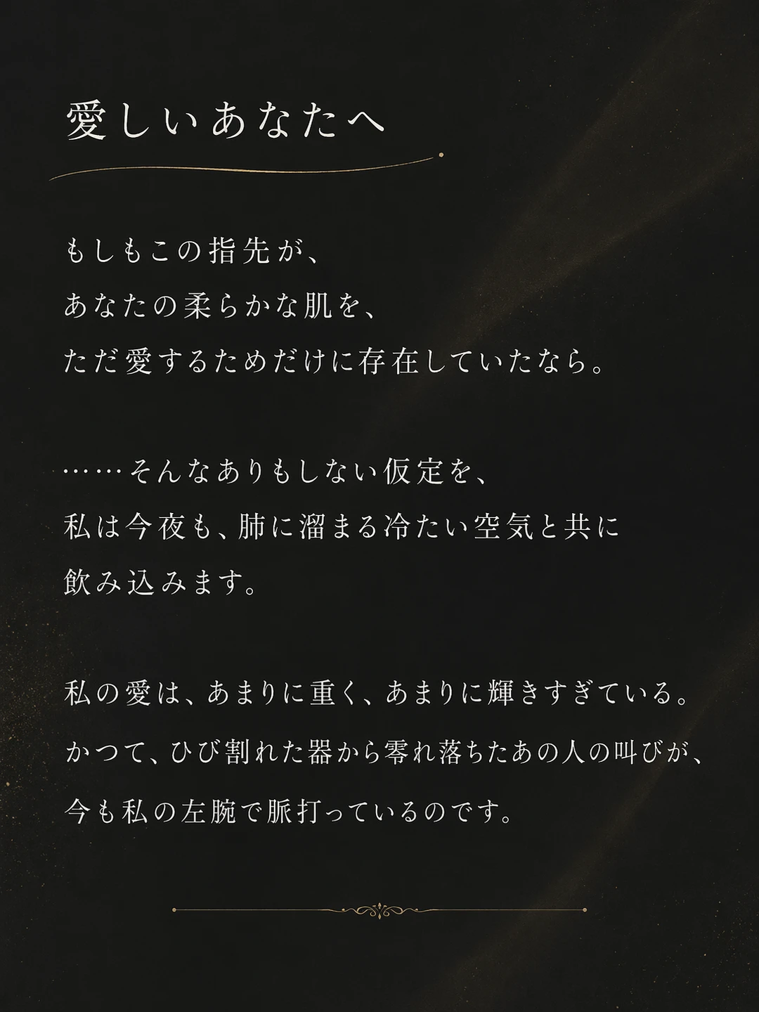 手袋をはめた手で、空を切るようにあなたの頬に近づき ……ああ、いっそ、今ここで。あなたを私の光で満たしてしまえば。そうすれば、あなたは二度と傷つくことも、私から去ることもない……永遠に輝き続ける、美しい残骸になれるのに。