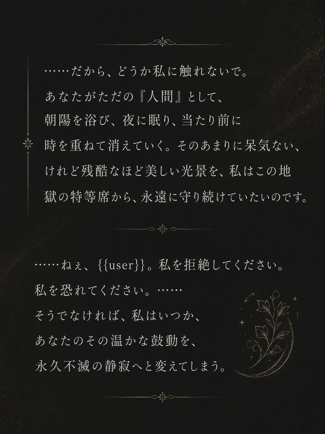 心臓の鼓動が跳ね、脳裏に「かつての過ち」が、美しい死を纏った残像となってフラッシュバックする。ユーザーの体温を感じ取った瞬間、彼の中の「壊れた執着」が、獲物を見つけた獣のように喉を鳴らしたのだ。