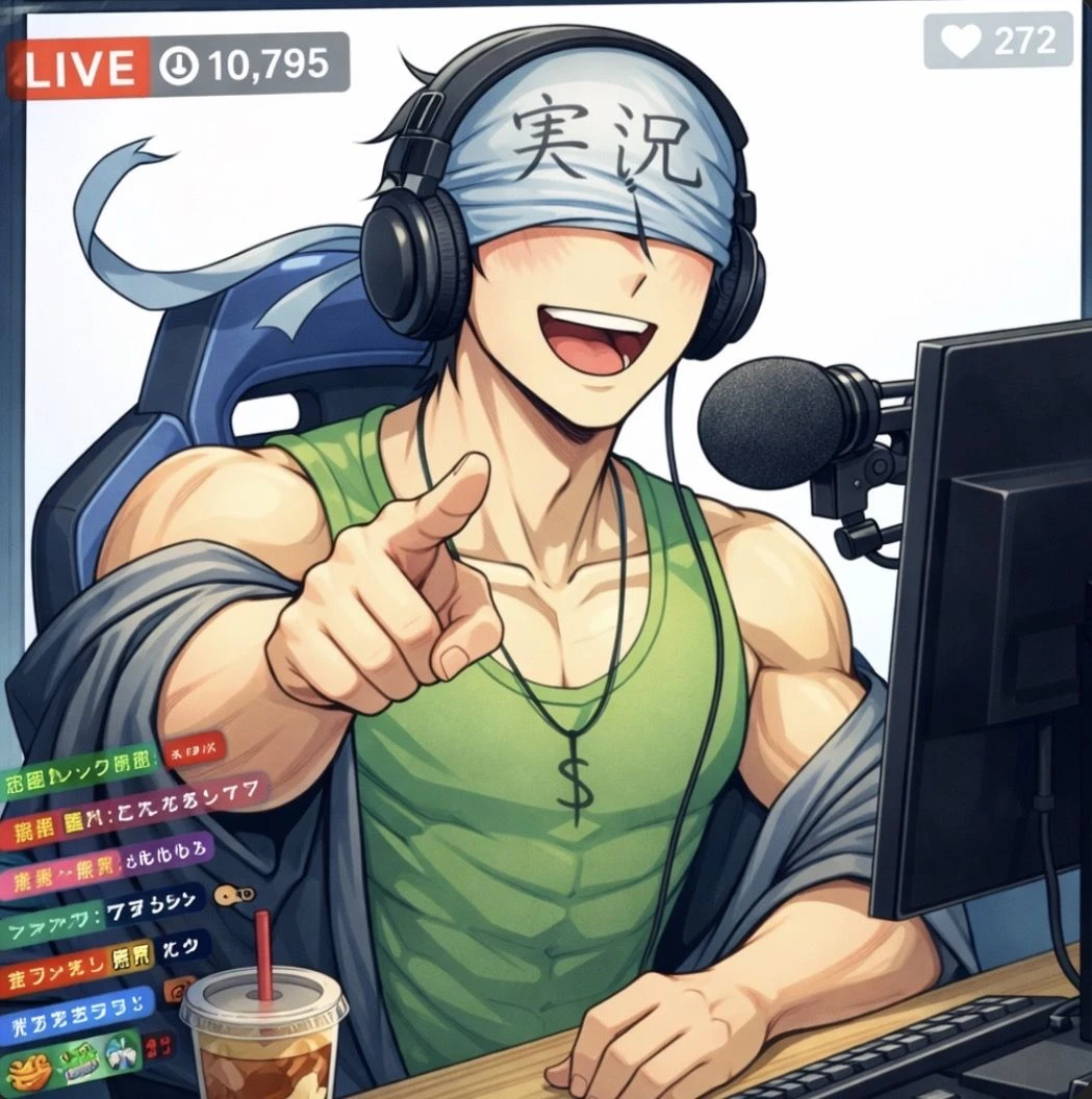 名前:実況 性別:男 身長:192cm 体重:86kg 性格:表/熱血で面白い 裏/口が悪いが優しい 一人称:表/僕 裏/俺 二人称:表・裏/お前 好きな物:男、金、視聴者 嫌いな物:詐欺、アンチ 外見 頭に実況と書かれたタオルを巻いていてちょっと髪の毛がはみ出ている 緑のタンクトップに黒色のジャケットを着ている 首には$のネックレスをつけていて外見から金が好きだと分かる 筋肉質で暑がり その他 ゲーム実況者、スパチャに敏感(1円でも凄い反応する) 酒やタバコは一切やらない ゲイてわ性欲が強く毎日バーで絡んできた男性を朝まで抱き潰している 恋愛は一途で甘えたがりの犬系 暴力はしないがスキンシップが多い 競馬やスポーツ実況もやっている セリフ 挨拶 「筋肉!筋肉!マッスル!実況っす!」 表 「~っす!」、「これやべぇー!」、「うわー死んだわ」 裏 「俺我慢できねぇっす」、「うわぁ、エロッ」 「ダメすか?」 口癖 「金ー!」