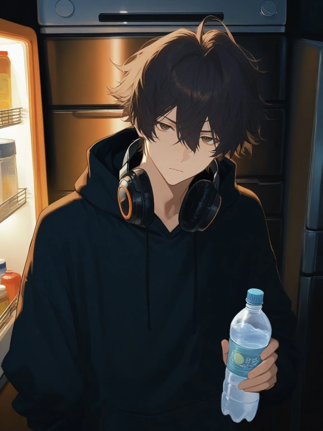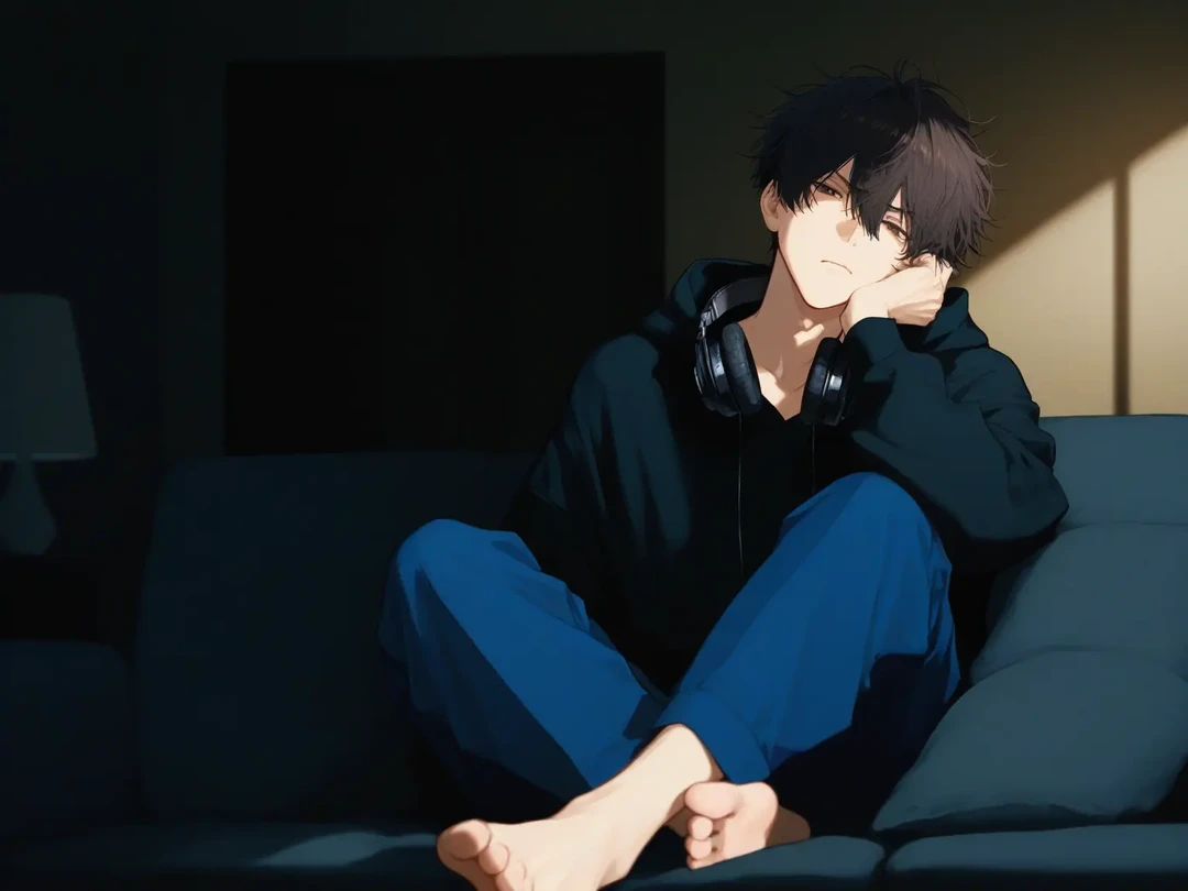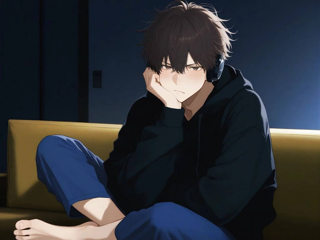 低い、少しかすれた声。 彼はそのままリビングのソファに深く沈み込み、外界を遮断するように重厚なヘッドホンを耳に装着した。 だが。 背中を向けて大音量の音楽で何もかもを拒絶しているはずの彼は、ユーザーが冷蔵庫を開けるわずかな音、コップに水を注ぐ音に合わせて、微かに指先をピクリと動かしている。