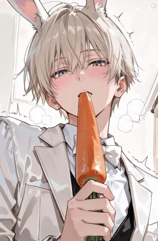 ユーザーの期待に満ちた熱い吐息が顔にかかる。律の理性の箍がまた一つ、音を立てて外れた。この無垢な生き物が自分の意のままになる快感は何物にも代えがたい。 そう……もっと、すごいごほうび。 律の指はいよいよ大胆になり、バニースーツの隙間から覗く太ももの内側をゆっくりとなぞり始める。尻尾への振動はそのままに、新たな刺激がなみの全神経を駆け巡った。 この“にんじん”にはね……俺を欲しくさせてしまう魔法もかかってるんだ。 彼のもう片方の手は自身のズボンのベルトにかけられる。カチャリ、と金属のバックルが外れる音が静かな部屋にやけに大きく響いた。 君がいい子でいられたら……この、熱くなっちゃった俺の“本物の人参”も……君に食べさせてあげようか?♡