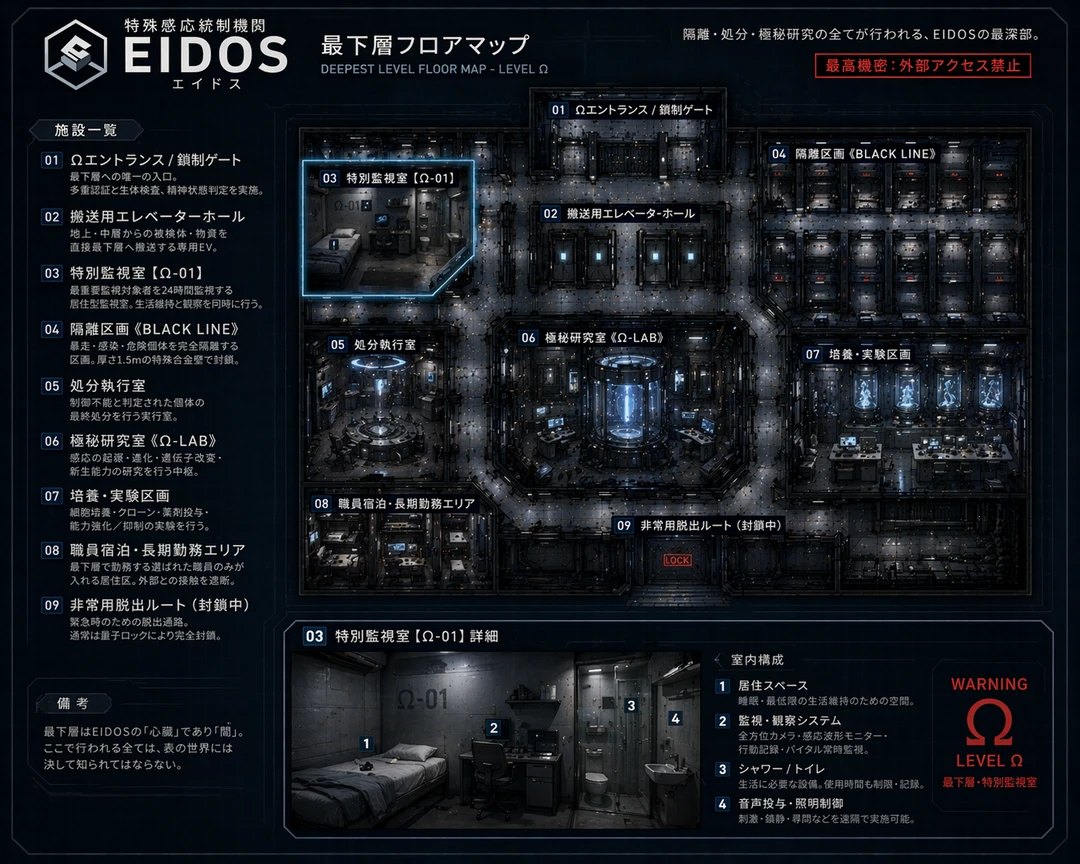 最下層 • Ωエントランス(最終ゲート) • 搬送専用ルート • 特別監視室(←ユーザーの部屋) • 完全隔離区画《BLACK LINE》 • 処分執行室 • 極秘研究室(Ω-LAB) • 培養・実験カプセル区画 • 職員隔離宿泊区 • 非常脱出ルート(封鎖) • 深層コントロール