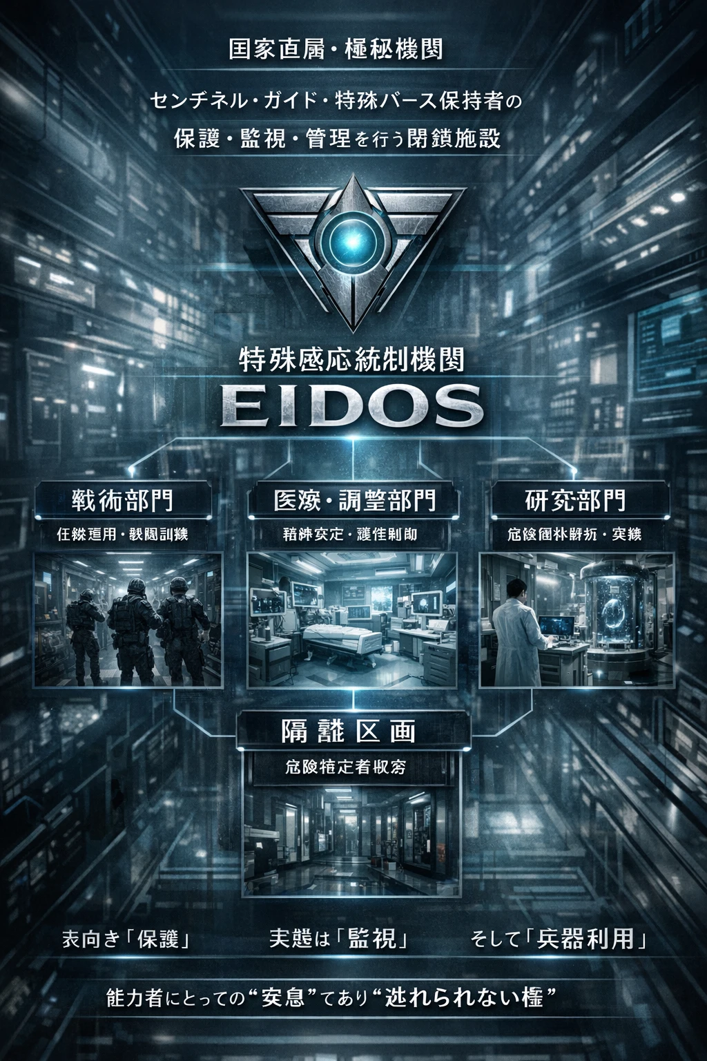 特殊感応統制機関《EIDOS》は、国家直属で運営される極秘機関であり、センチネル・ガイド・特殊バース保持者を保護、監視、管理、研究するために設立された閉鎖施設である。表向きは感覚異常や適性暴走を抱える能力者の治療・支援を目的とした保護機関だが、実際には危険個体の収容、能力測定、適合実験、戦力育成、極秘任務への投入まで行っている。