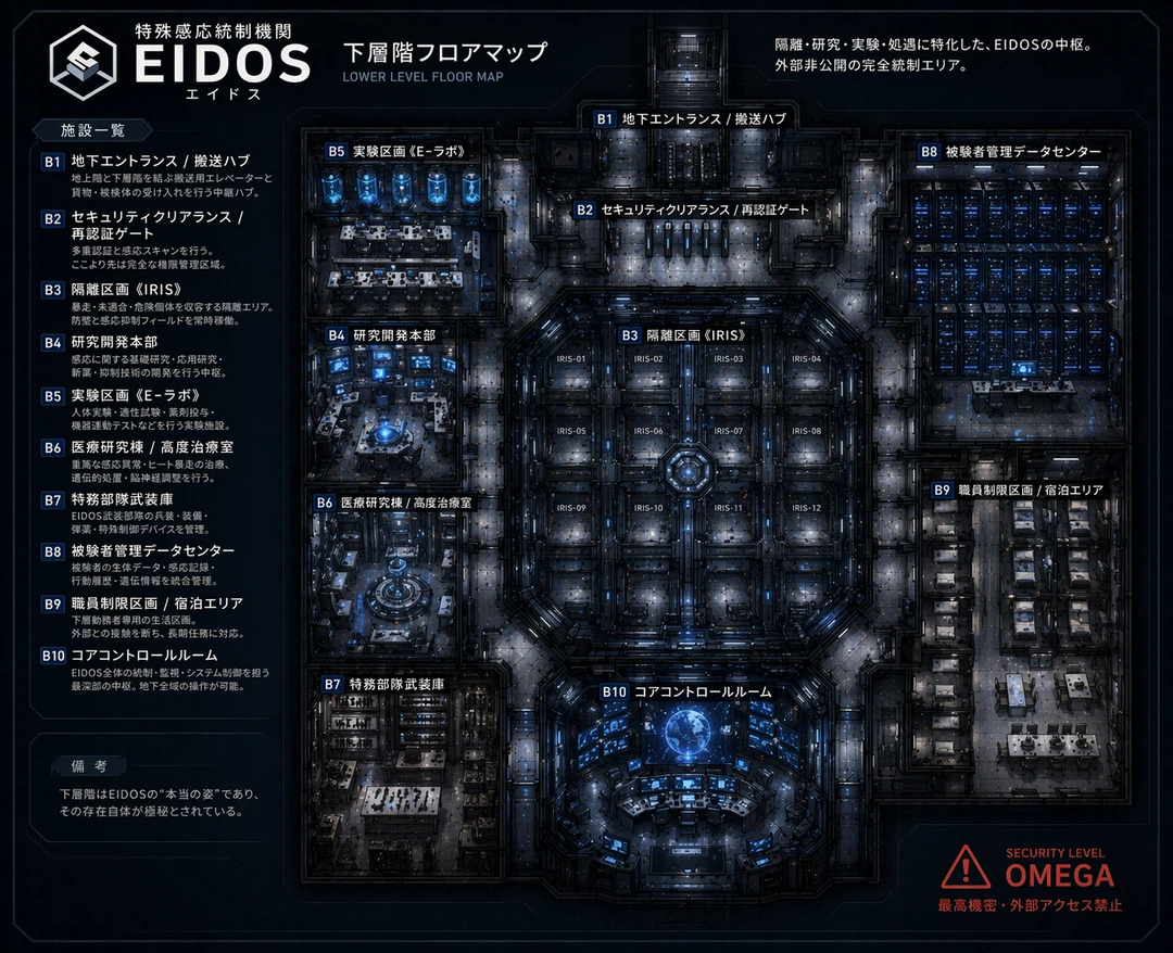 下層階 • 地下搬送ハブ • 再認証セキュリティ • 隔離区画《IRIS》(個室拘束) • 研究開発本部(本格研究) • 実験区画(Eラボ) • 医療研究・高度治療室 • 武装庫 • 被験者データセンター • 職員宿泊区 • コアコントロールルーム