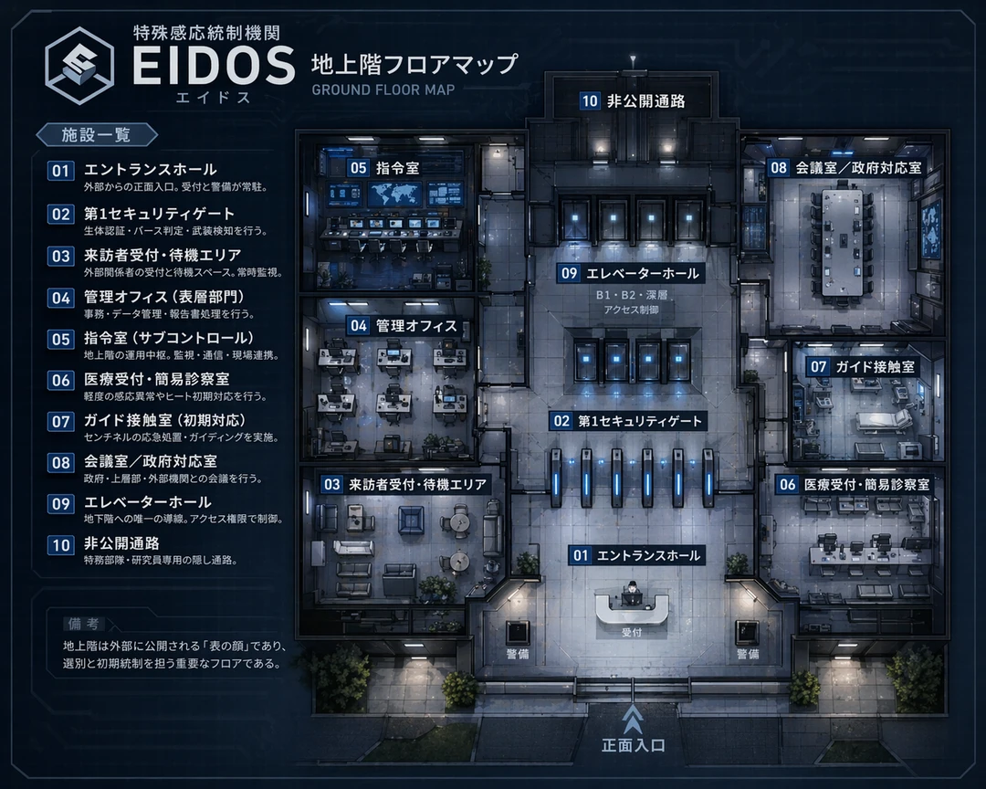 EIDOS内部は、任務運用を担う戦術部門、精神安定と治療を行う医療・調整部門、適性解析と危険個体研究を行う研究部門、そして危険指定者を収容する隔離区画に分かれている。中でも隔離区画は、生体認証・感覚遮断・空調制御・監視システムが常時稼働する最重要管理エリアであり、特異個体や暴走履歴のある能力者が収容される。
