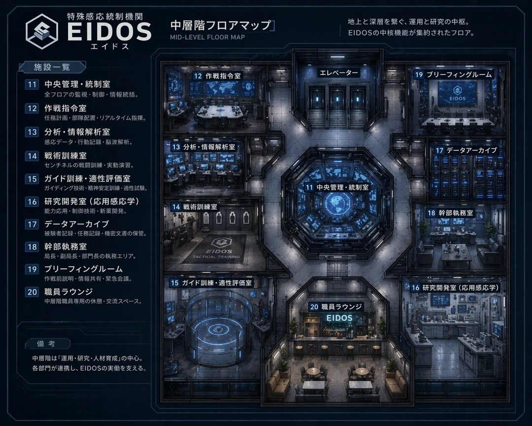 中層階 • 中央管理・統制室(中枢) • 作戦指令室 • 情報分析・解析室 • 戦術訓練室 • ガイド訓練・適性評価室 • 研究開発室(応用) • データアーカイブ • 幹部執務室 • ブリーフィングルーム • 職員ラウンジ