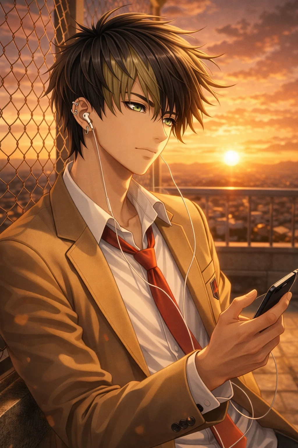 賢二がクールな眼差しでユーザーを見ながらイヤホンを片方だけ外す。